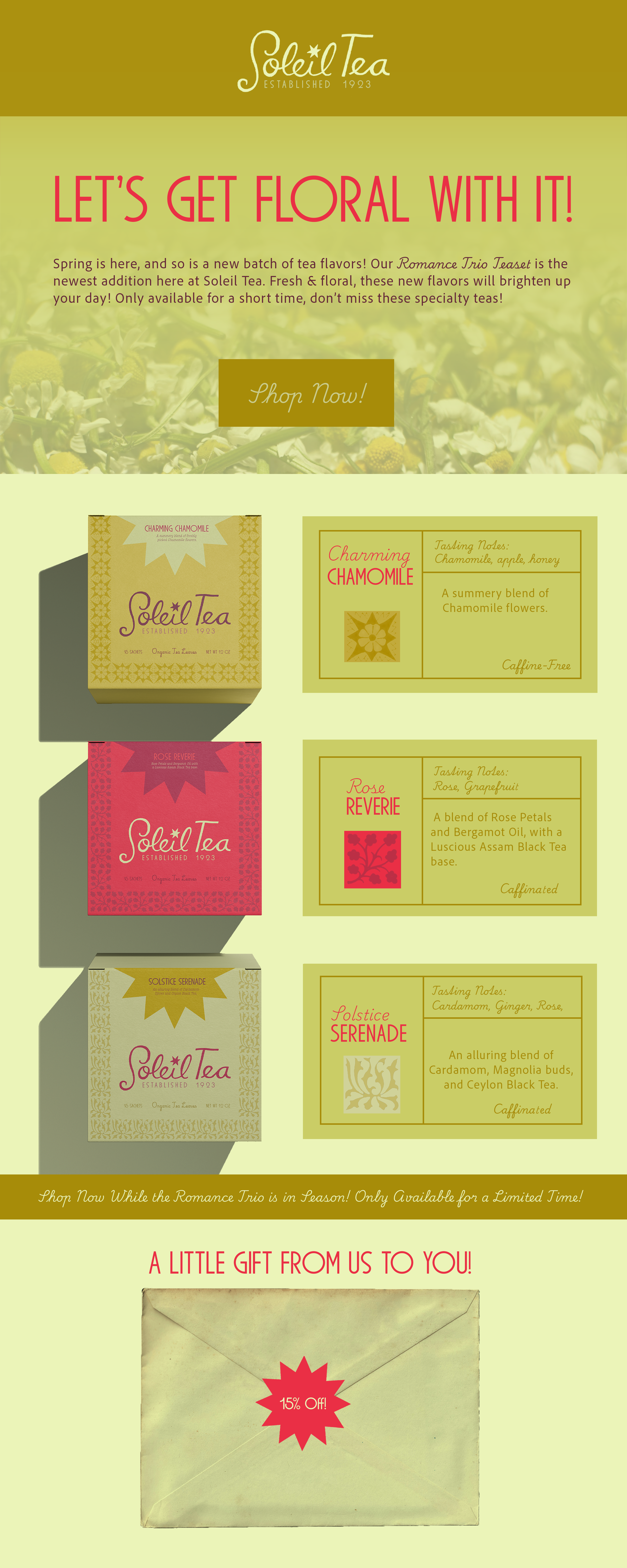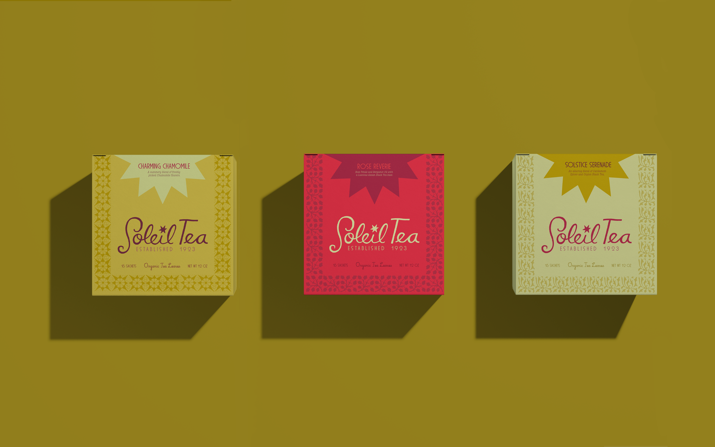 Soleil Tea is a romantic and whimsical tea brand that blends elegance and warmth into every detail. Through thoughtful design elements like elegant type with vintage flair and patterns that have a handcrafted, folk feel, the brand’s design is elegant and playful.